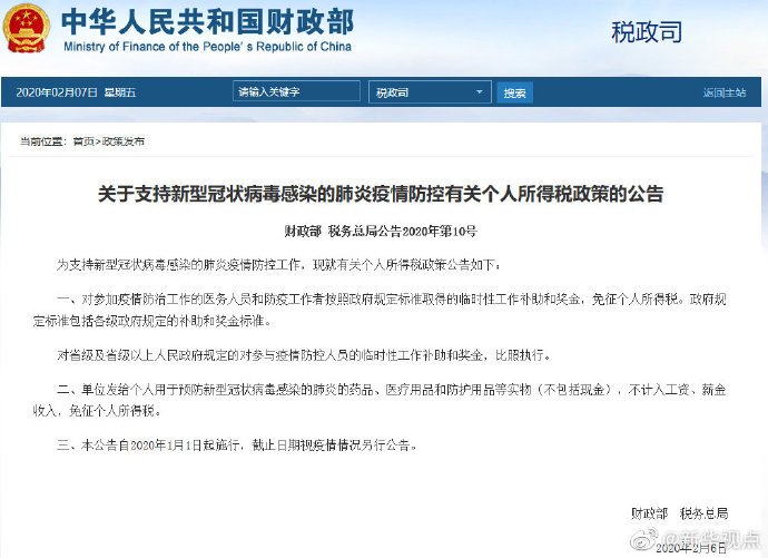 財(cái)政部、國(guó)家稅務(wù)總局7日對(duì)外聯(lián)合發(fā)布公告,明確對(duì)參加疫情防治工作的醫(yī)務(wù)人員和防疫工作者按照政府規(guī)定標(biāo)準(zhǔn)取得的臨時(shí)性工作補(bǔ)助和獎(jiǎng)金,免征個(gè)人所得稅。單位發(fā)給個(gè)人用于預(yù)防新型冠狀病毒感染的肺炎的藥品、醫(yī)療用品和防護(hù)用品等實(shí)物(不包括現(xiàn)金),不計(jì)入工資、薪金收入,免征個(gè)人所得稅。(記者劉紅霞、郁瓊源)?