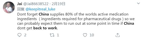 推特用戶Jai說:不要忘了中國供應著全世界80%的活性藥物成分,因此如果中國不復工復產,它們可能會在某個時間點用完。