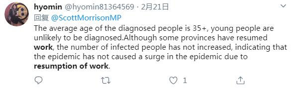 推特用戶hyomin說,一些省份已經復工,不過受感染的人數沒有隨之增加,這表明復工復產沒有導致更多感染病例。