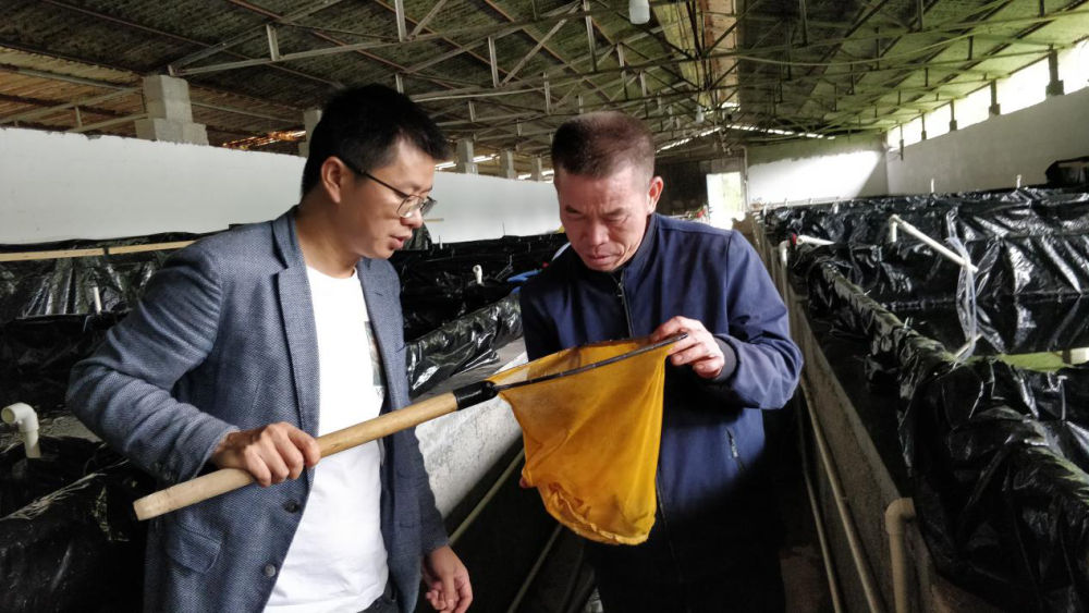 廣西上林縣西燕鎮(zhèn)岜獨村駐村第一書記康勇(左一)在龜鱉養(yǎng)殖場和養(yǎng)殖能人交流(4月24日攝)。新華社記者 農(nóng)冠斌 攝