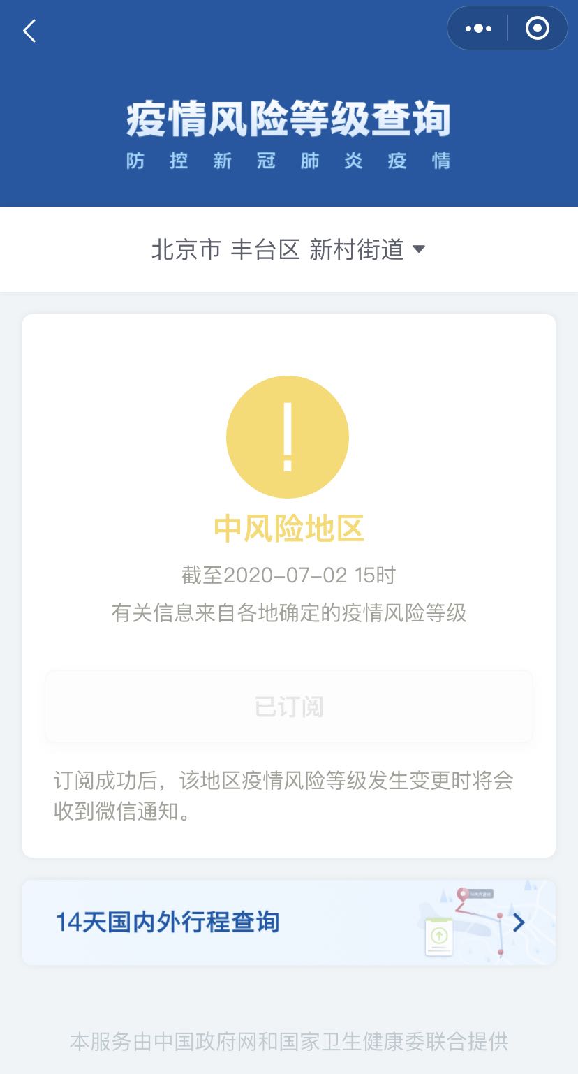 記者從國務(wù)院客戶端小程序“疫情風險等級查詢”了解到,截至7月2日15時,北京市豐臺區(qū)新村街道由高風險地區(qū)降級為中風險地區(qū)。