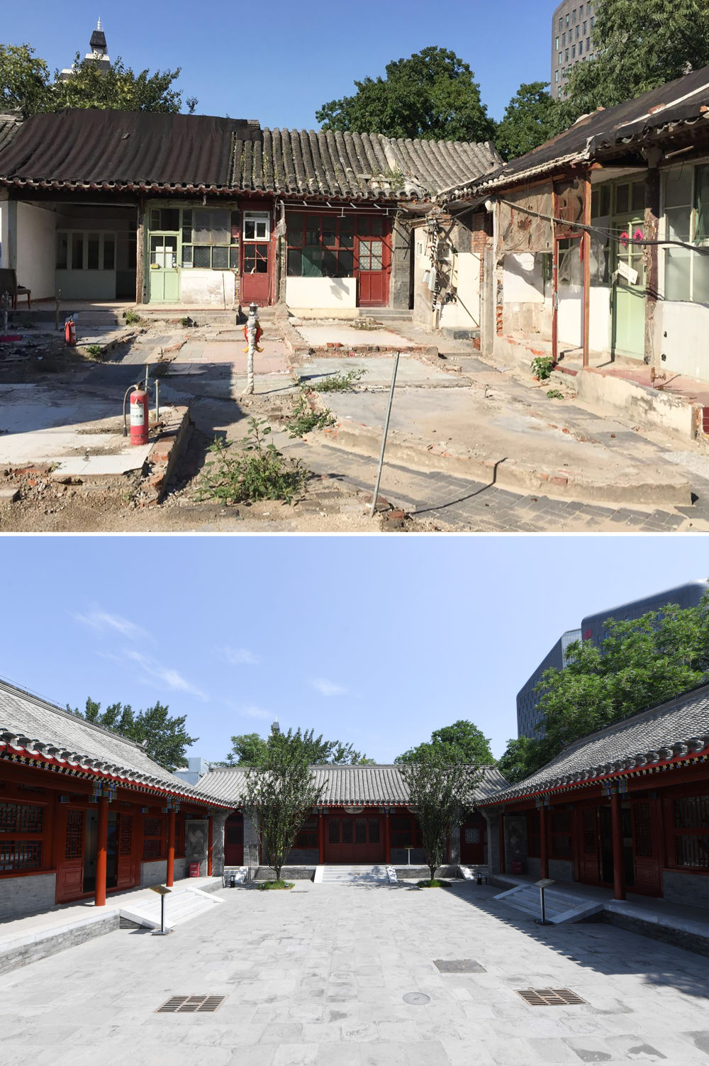 這是一張拼版照片,上圖為:騰退修繕中的沈家本故居(資料照片);下圖為:6月10日拍攝的沈家本故居(新華社記者鞠煥宗攝)。新華社發(fā)