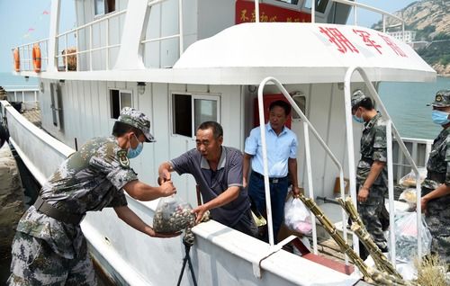 7月16日,“泰叔”錢均堂(左二)在“擁軍船”靠岸蘇山島后搬運送給部隊官兵的慰問品。新華社記者 王凱 攝