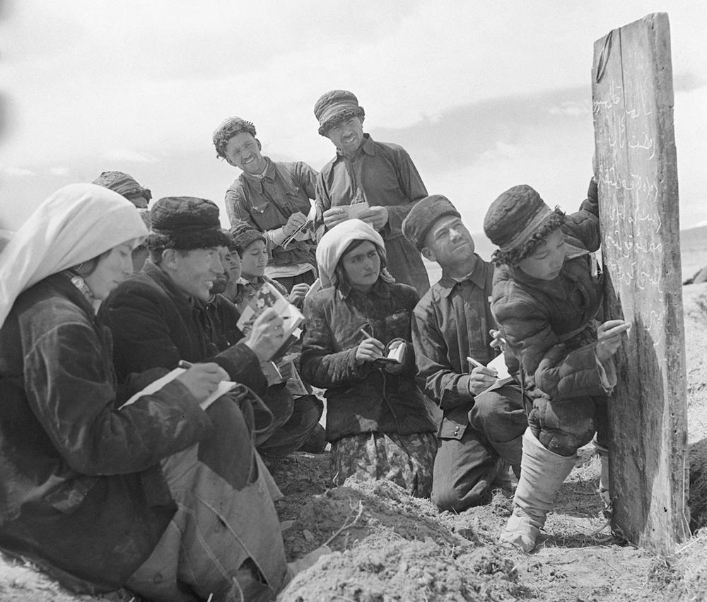 ↑ 1960年,新疆塔什庫爾干塔吉克族自治縣慕士塔格人民公社二大隊(duì)的社員在小學(xué)生的幫助下學(xué)習(xí)文化。