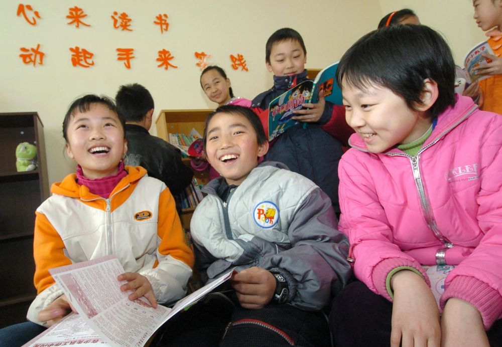 ↑ 這是2008年9月1日,江西樟樹市第二小學(xué)五(1)班鄧文?。ㄖ校┑韧瑢W(xué)領(lǐng)到免費(fèi)教科書。
