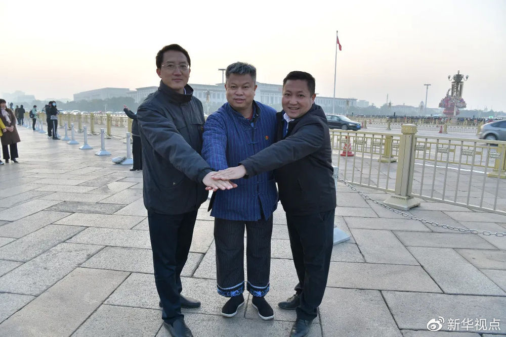 11月6日,十八洞村三任扶貧工作隊(duì)長(zhǎng)龍秀林(中)、石登高(左一)、麻輝煌(右一)觀看升國(guó)旗儀式后同國(guó)旗合影 新華社記者李賀 攝