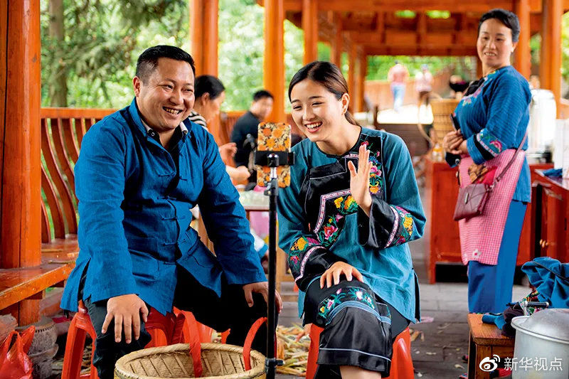 5月15日,十八洞村第三任扶貧工作隊(duì)隊(duì)長(zhǎng)麻輝煌(左)與返鄉(xiāng)大學(xué)生施林嬌一起通過(guò)網(wǎng)絡(luò)直播推銷(xiāo)土特產(chǎn) 新華社記者陳思汗 攝