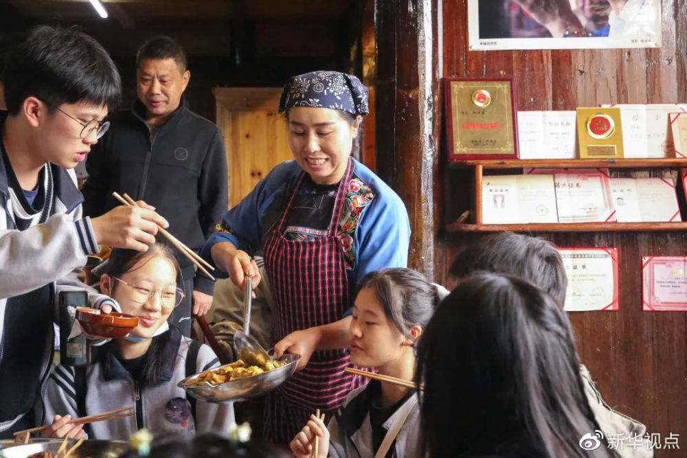 10月26日,十八洞村村民施進(jìn)蘭的妻子龍齊英(中)在農(nóng)家樂(lè)給游客們上菜(受訪(fǎng)者供圖) 新華社發(fā)