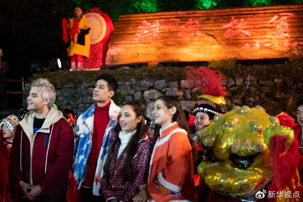 1月18日,多位外國(guó)友人受邀來(lái)到湘西十八洞村參加十八洞村的小年“村晚”,他們?cè)谑硕创蹇诤嫌?新華社記者張玉潔 攝