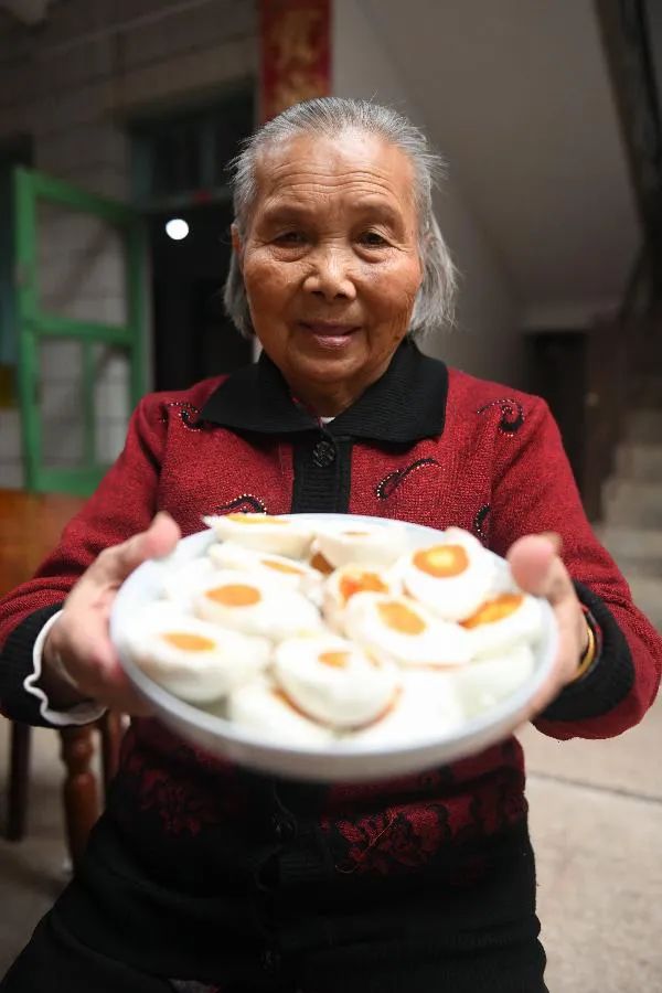 全國脫貧攻堅獎奮進獎獲得者廖秀英老奶奶在贛州瑞金市葉坪鄉(xiāng)鳳崗村家中向游客展示咸鴨蛋 劉青 攝