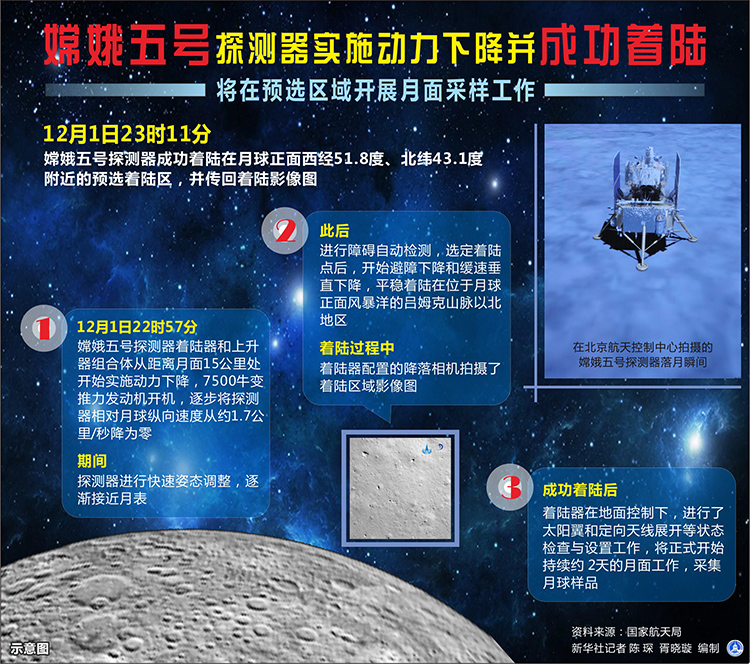 圖表:嫦娥五號探測器實施動力下降并成功著陸 將在預(yù)選區(qū)域開展月面采樣工作 新華社記者 陳琛 編制