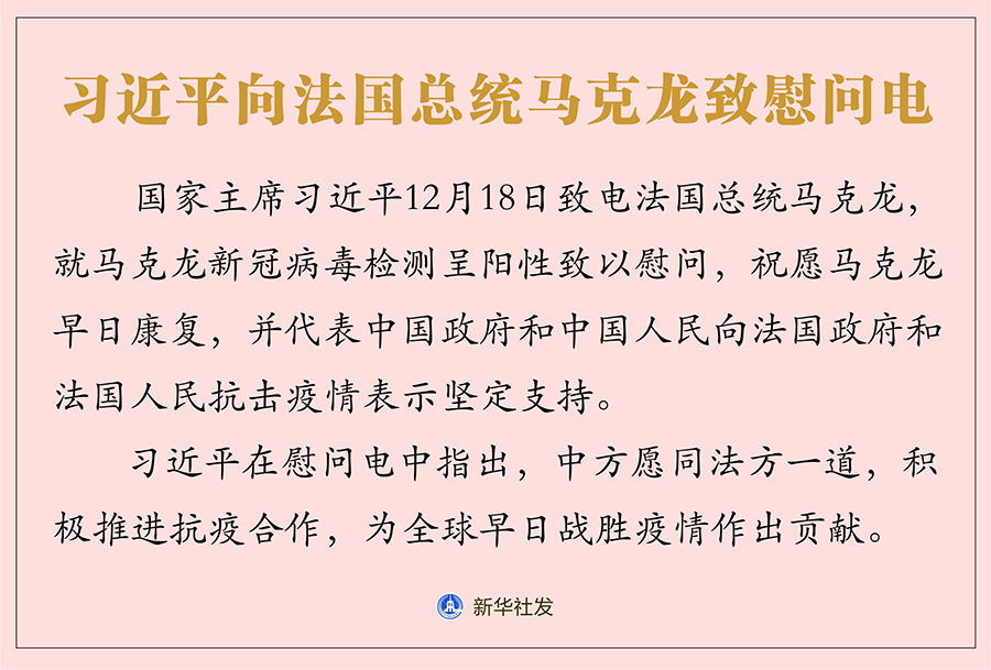新華社北京12月18日電 國(guó)家主席習(xí)近平18日致電法國(guó)總統(tǒng)馬克龍,就馬克龍新冠病毒檢測(cè)呈陽(yáng)性致以慰問(wèn),祝愿馬克龍?jiān)缛湛祻?fù),并代表中國(guó)政府和中國(guó)人民向法國(guó)政府和法國(guó)人民抗擊疫情表示堅(jiān)定支持。
