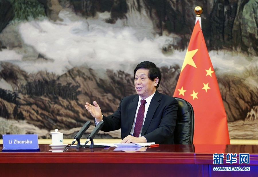 12月21日,全國人大常委會委員長栗戰(zhàn)書在北京人民大會堂以視頻方式同韓國國會議長樸炳錫舉行會談。新華社記者 張領(lǐng) 攝