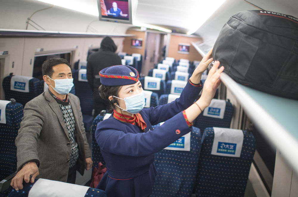 ??12月16日,武漢客運段高鐵乘務員艾婷婷在幫助旅客放行李。