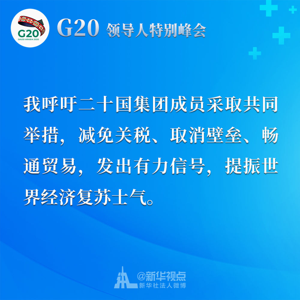 我呼吁二十國集團成員采取共同舉措,減免關(guān)稅、取消壁壘、暢通貿(mào)易,發(fā)出有力信號,提振世界經(jīng)濟復蘇士氣。我們應該制定二十國集團行動計劃,并就抗疫宏觀政策協(xié)調(diào)及時作出必要的機制性溝通和安排。