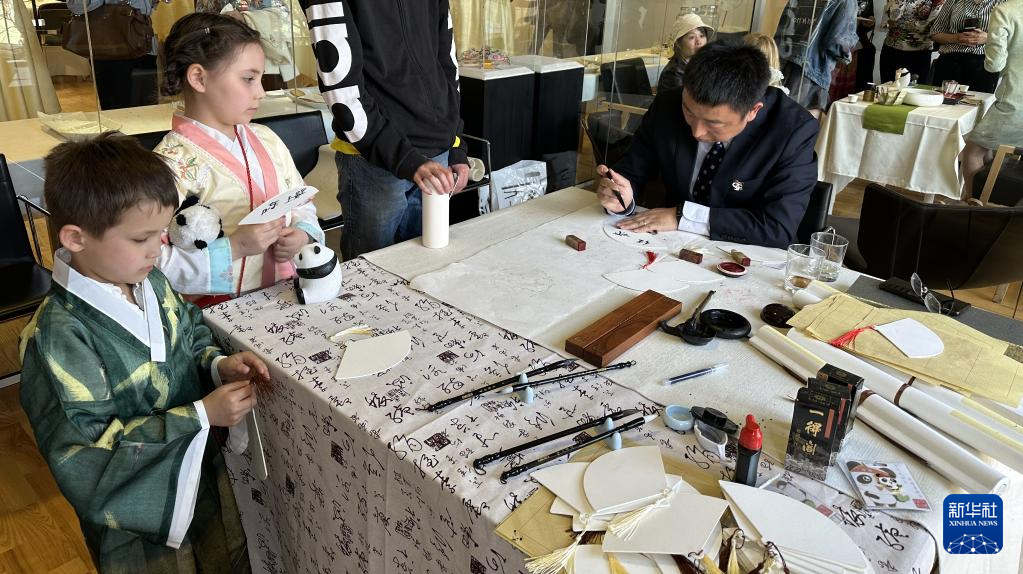 5月7日,在瑞典首都斯德哥尔摩的中国文化中心,瑞典儿童观看中国书法展示。