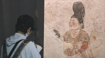 5月11日,游客在陕西历史博物馆内观看唐章怀太子墓《客使图》。《客使图》描绘的是唐代外交机构鸿胪寺官员接待外国使节的场景。