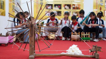 5月24日,民间艺人在河北省沙河市塔子峪村非遗传习所内为小学生讲解四匹缯布制作技艺。