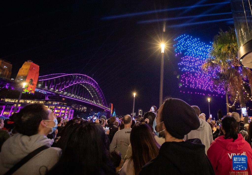 6月7日,在澳大利亚悉尼,游客欣赏无人机表演。