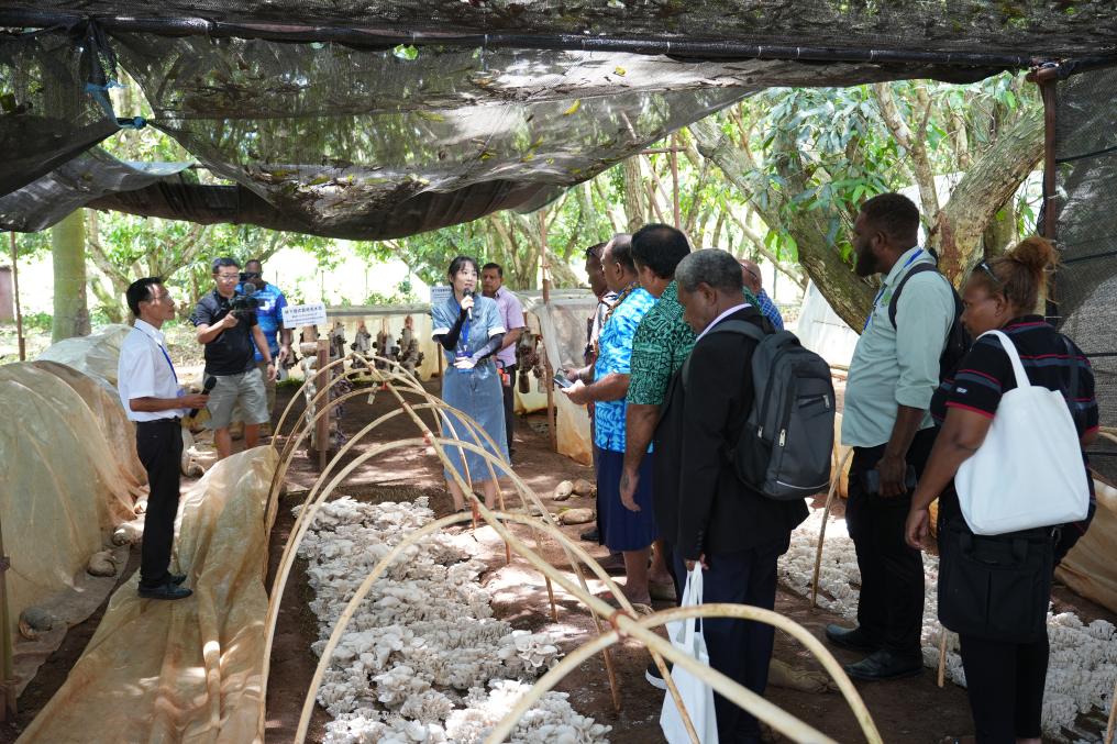 2025年11月19日,在斐济楠迪中国—太平洋岛国菌草技术示范中心,太平洋地区菌草产业发展研讨会与会代表参观菌草菇种植示范基地。新华社发(高鑫摄)