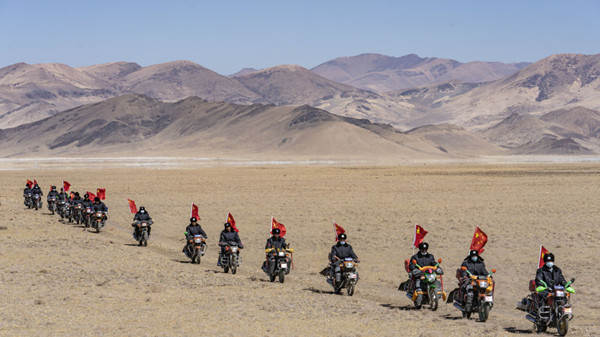 西藏日喀則市薩嘎縣昌果鄉(xiāng)的一處村莊里,48歲的藏族漢子石覺塔布在風(fēng)中跨上一輛摩托車,向平坦無垠的高原邊緣騎去。他的車尾插著一面五星紅旗,被風(fēng)吹得獵獵作響,即便駛出很遠(yuǎn),那抹紅色在車輪卷起的煙塵中也依然醒目。