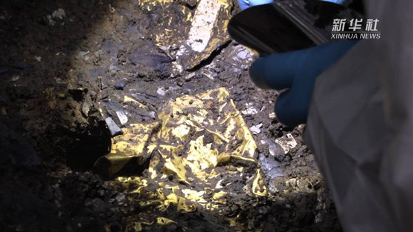 此次新發(fā)現(xiàn)的6個坑狀祭祀遺跡在第1、2號祭祀坑旁。面積僅3.5平方米的5號祭祀坑內(nèi)一片金光閃閃,已清理出多件金器、玉質(zhì)管珠和象牙飾品等。正在發(fā)掘的3號祭祀坑每天都有新發(fā)現(xiàn),6號祭祀坑確認(rèn)一具“木匣”,長約1.5米、寬約0.4米,木匣內(nèi)外均涂抹朱砂,目前尚不能確認(rèn)其用途。