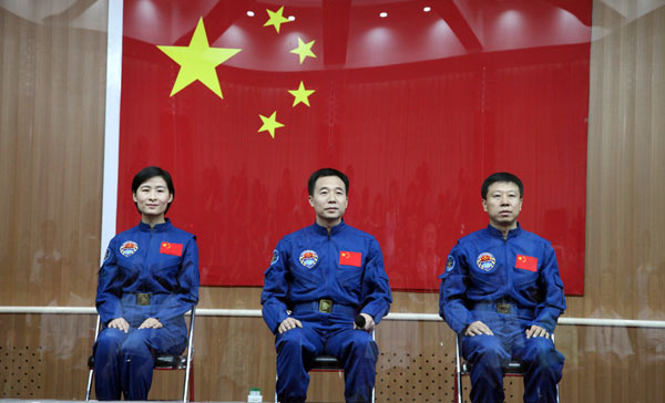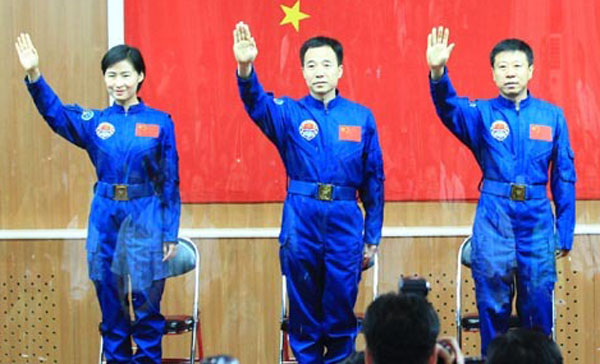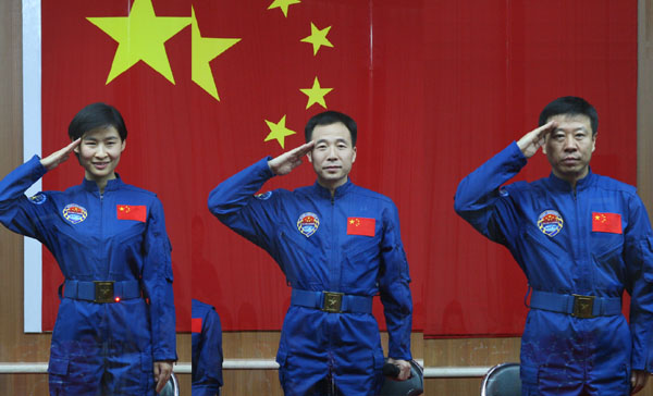 航天員景海鵬、劉旺、劉洋向大家致禮