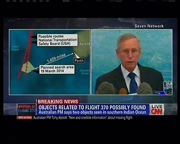 ??? 澳方稱在印度洋中發(fā)現(xiàn)了可能與馬航失聯(lián)客機有關物體這張3月20日拍攝的CNN視頻截圖顯示,澳大利亞海事安全局官員在堪培拉召開的新聞發(fā)布會上發(fā)言。澳大利亞總理阿博特當日在議會說,澳方在印度洋中發(fā)現(xiàn)了可能與馬航失聯(lián)客機有關的兩個物體。澳大利亞海事安全局官員當日說,發(fā)現(xiàn)可疑碎片的位置與之前確定的馬航失聯(lián)客機南部搜尋航道高度吻合,但當?shù)睾S蛩沫h(huán)境非常差。新華社發(fā)
