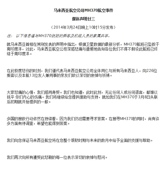 ????馬航官方網(wǎng)站上的《媒體聲明廿三》表示,“在此極度悲傷的時(shí)刻,我們謹(jǐn)代表馬來西亞航空公司全體同仁與所有馬來西亞人,向226位乘客以及本航13位友人兼同事的親友們致以深切的哀悼與祈禱。”