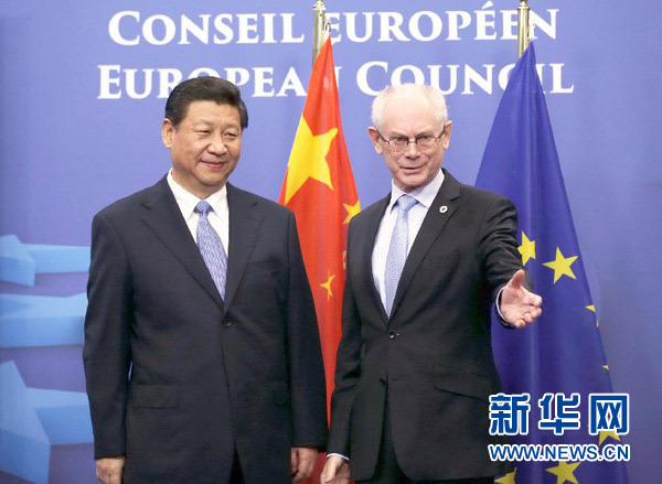 ????新華網(wǎng)布魯塞爾3月31日電(記者 魏建華 錢彤)國家主席習(xí)近平31日在布魯塞爾同歐洲理事會主席范龍佩舉行會談。雙方就新形勢下深化中歐全面戰(zhàn)略伙伴關(guān)系廣泛深入交換意見,達(dá)成重要共識。習(xí)近平強(qiáng)調(diào),要從戰(zhàn)略高度看待中歐關(guān)系,將中歐兩大力量、兩大市場、兩大文明結(jié)合起來,共同打造中歐和平、增長、改革、文明四大伙伴關(guān)系,為中歐合作注入新動力,為世界發(fā)展繁榮作出更大貢獻(xiàn)。