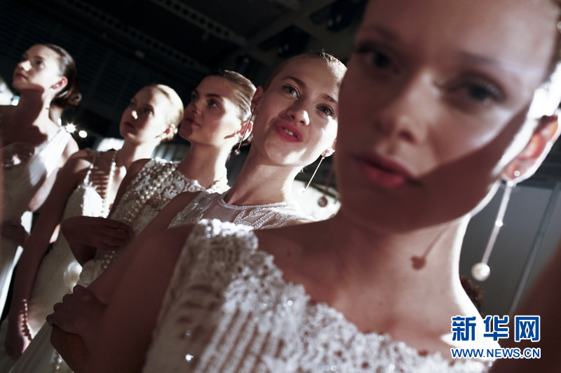 場外正在準(zhǔn)備登臺展示婚紗的模特。