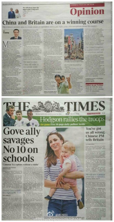 ????新華網(wǎng)北京6月17日電 據(jù)新華社“新國際”微博報道,訪英前夕,李克強(qiáng)總理16日在英國主流媒體《泰晤士報》發(fā)表題為“中英正走在共贏的道路上”的署名文章。對此,該報同日在頭版配發(fā)文章稱,李克強(qiáng)的文章標(biāo)志著一場“展示真正中國的運(yùn)動”已開始,中國作為世界重要國家,將為維護(hù)和平與合作作出積極貢獻(xiàn)。?