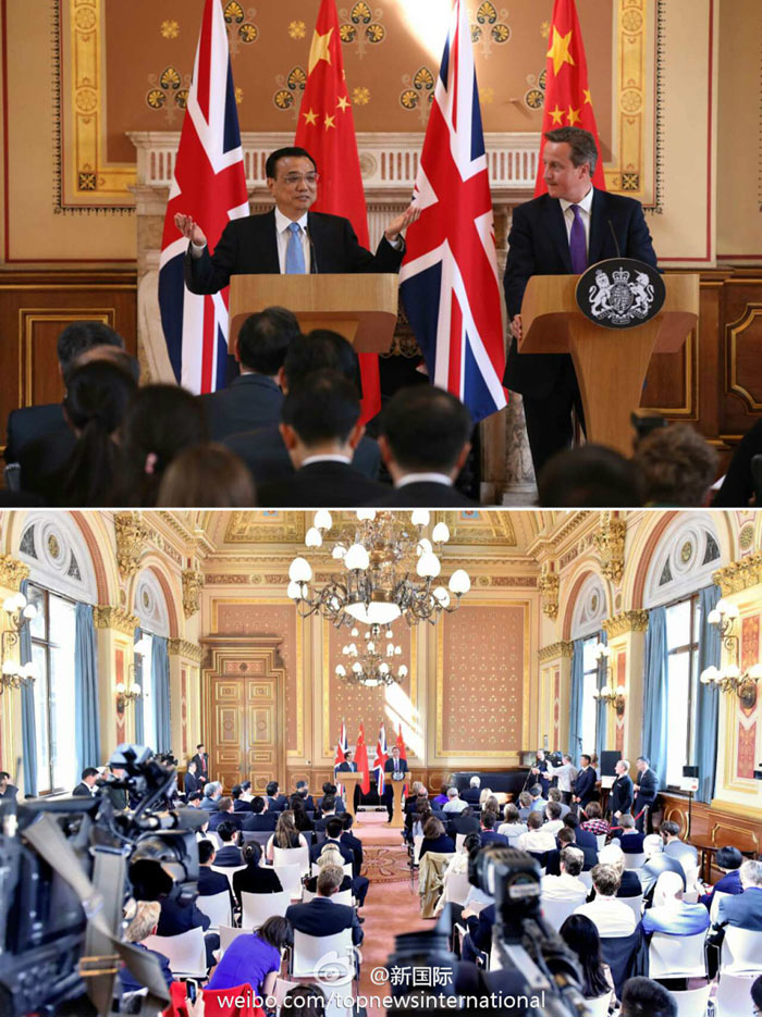???? 新華網北京6月18日電 據新華社“新國際”微博報道,17日李克強與卡梅倫共見記者時說,今天陽光明媚是個好日子,英國有句諺語:把握一個今天,勝似兩個明天。中國也常說“時不我待”。中英合作基礎好、潛力大,雙方有責任搶抓機遇,規(guī)劃新路線,鋪設快車道,使兩國關系明天更加燦爛。