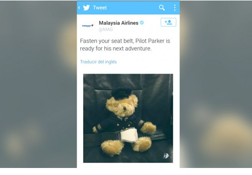 據(jù)阿根廷Infobae網(wǎng)站7月17日?qǐng)?bào)道,馬來(lái)西亞航空公司的MH17航班在烏克蘭東部墜毀后,該航空公司刪除了MH17航班出事前的最后一條官方推特。這條英文推特的內(nèi)容是:系上安全帶,飛行員“派克”已經(jīng)準(zhǔn)備好了下一次旅程。推特還配了一張玩具熊假扮成飛行員準(zhǔn)備起飛的照片。