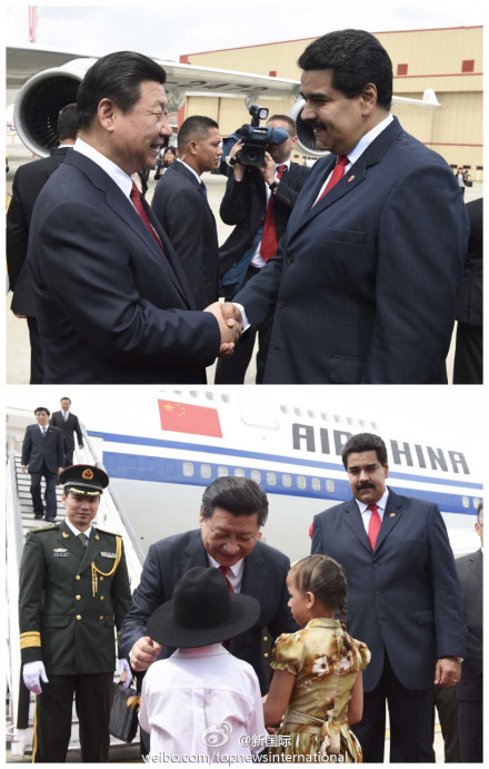 ????新華網(wǎng)北京7月21日電 據(jù)新華社“新國際”微博報道,經(jīng)過近7小時飛行,習(xí)近平主席當(dāng)?shù)貢r間20日下午飛抵加拉加斯。專機進入委領(lǐng)空后,委空軍2架蘇-30戰(zhàn)機升空護航。馬杜羅總統(tǒng)親自到機場迎接。隨后,歡迎儀式在機場隆重舉行,習(xí)近平在馬杜羅陪同下檢閱儀仗隊。