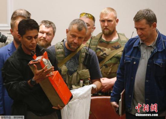 當(dāng)?shù)貢r間2014年7月22日,頓涅茨克,“頓涅茨克人民共和國”官員向馬來西亞調(diào)查人員移交馬航MH17航班客機黑匣子。