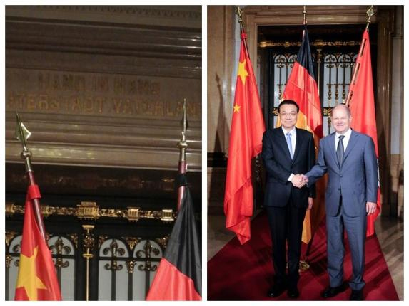 市政廳里,站在代表中國(guó)、德國(guó)和漢堡的三面旗幟前,克強(qiáng)總理與肖爾茨市長(zhǎng)的手緊緊相握。在他們的身后,大門(mén)門(mén)楣上鐫刻著這樣一句話“hand in hand”。