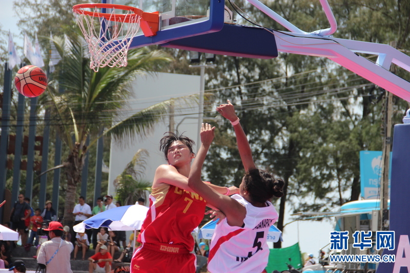 ??? 11月16日,中國沙灘籃球運動員黃銀婷(左)在比賽中。中國體育代表團16日在泰國普吉舉行的第四屆亞洲沙灘運動會上勇奪2枚金牌和2枚銅牌。當天比賽全部結(jié)束時,中國隊以3金2銀5銅的成績暫列獎牌榜第五。新華社發(fā)(塔納攝)