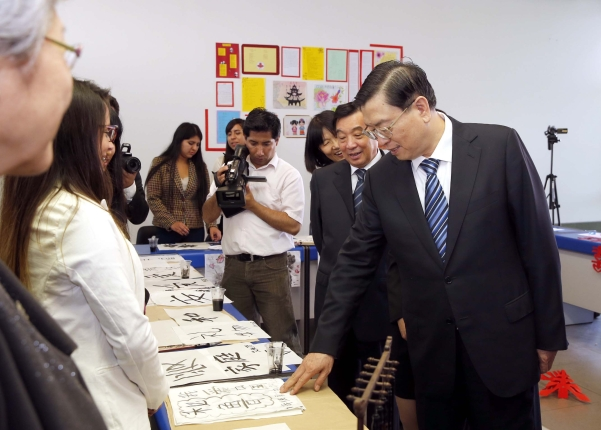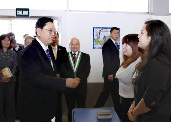 ??? 22日,全國人大常委會委員長張德江參觀秘魯里卡多·帕爾瑪大學(xué)孔子學(xué)院,與在這里學(xué)習(xí)中文的秘魯學(xué)生交流。