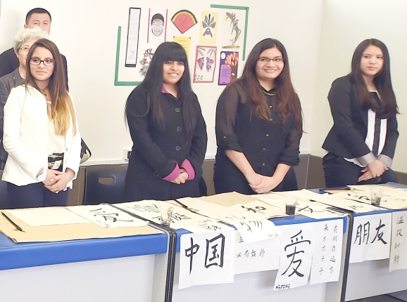 ??? 隨后,張德江走進(jìn)一間教室,這里掛著紅紅的“中國結(jié)”、燈籠,墻上貼著一幅對聯(lián)“根深則葉茂,源遠(yuǎn)而流長”。學(xué)生們有的在看中文書、有的在剪紙、還有的在練書法。