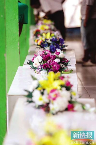 1日,在印尼中加里曼丹一家醫(yī)院,覆蓋鮮花的棺材擺放在地上。