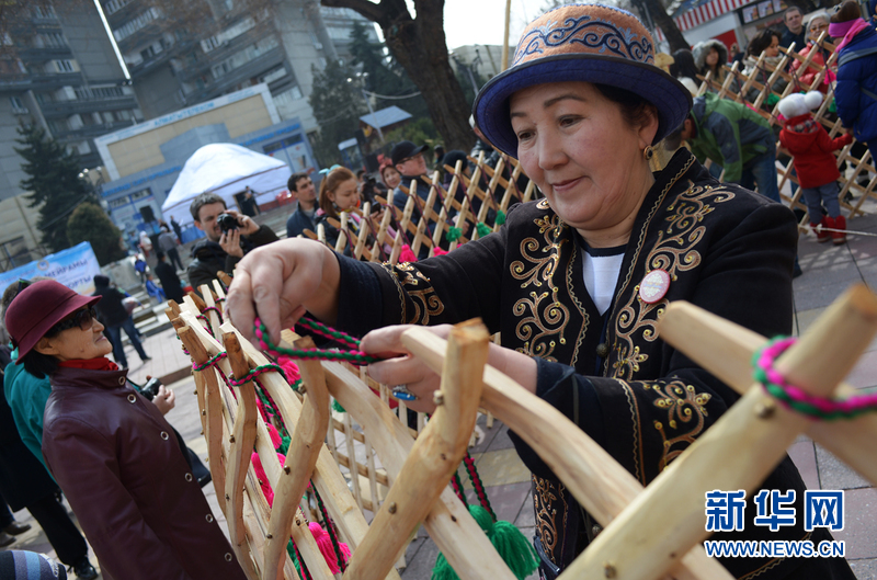 ????4月4日、5日,在阿拉木圖舉辦首界氈房節(jié)。穿著民族服裝的民間藝人搭起具有悠久傳統(tǒng)的哈薩克氈房。氈房上部為穹形,下部為圓柱形,四壁有網(wǎng)狀的木桿搭成整個氈房的骨架,外包白氈。氈房里四周是掛毯,地上是花氈地毯,上面刺著各種圖案,令人賞心悅目。哈薩克斯坦舉辦這次活動是為了將哈薩克氈房列入世界非物質文化遺產(chǎn)名錄。(文/盧敬利 圖/葉蓮娜)