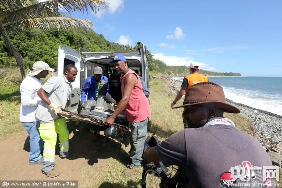 當(dāng)?shù)貢r間2015年8月11日,法屬留尼汪島,當(dāng)?shù)厮丫汝?duì)獲得的馬航MH370殘骸。