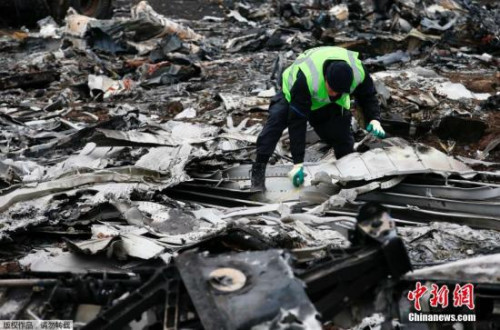 資料圖:當地時間2014年11月16日,烏克蘭頓涅茨克地區(qū),墜毀MH17飛機殘骸收集工作進行中。據悉,在事故現場已成功搜尋到起落架的部分殘骸,一大塊機身殘片和以及疑似乘客遺體。專家們希望將這些殘骸運往荷蘭之后,能夠通過技術手段還原某個部件,以確定事故具體原因。