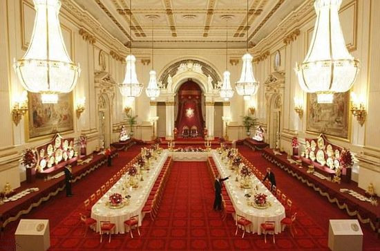 36.6米長(zhǎng)、18米寬、13.5米高的宴會(huì)廳(the Ballroom)是白金漢宮最大的房間,女王招待國(guó)外元首的國(guó)宴都在這里舉行。國(guó)宴一般由四道菜組成,白金漢宮的廚房可以同時(shí)供應(yīng)600位賓客一起用餐。