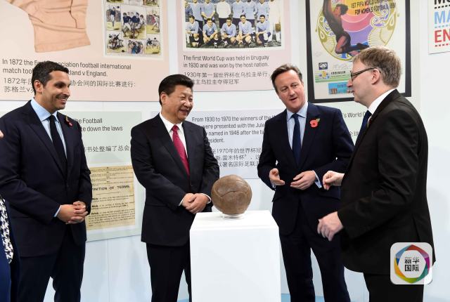 10月23日,國(guó)家主席習(xí)近平在英國(guó)首相卡梅倫陪同下,參觀曼徹斯特城市足球?qū)W院。新華社記者 饒愛民 攝