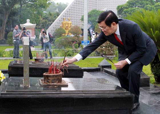 2014年5月7日,越南國(guó)家主席張晉創(chuàng)在奠邊府烈士陵園向烈士敬香。