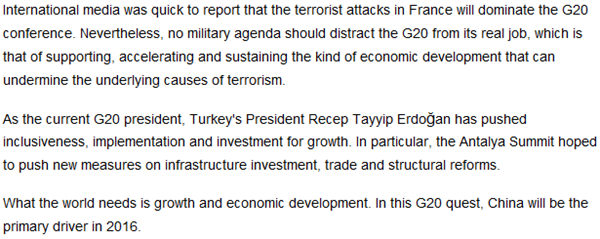 二十國集團領(lǐng)導人第十次峰會于15日下午在土耳其安塔利亞舉行第一階段會議。在二十國集團的不斷探索與實踐中,中國無疑將成為2016年世界經(jīng)濟的主要驅(qū)動力。