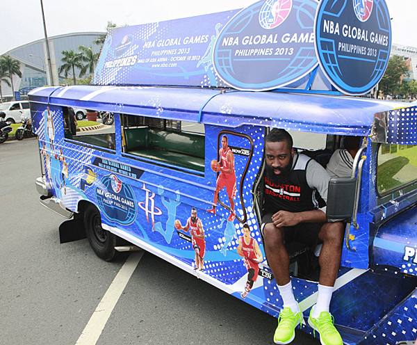 2013年10月8日,休斯敦火箭隊在菲律賓馬尼拉進行調(diào)整訓練期間,火箭隊球員哈登坐在一輛“吉普尼”巴士上。新華社發(fā)(宋穹攝)