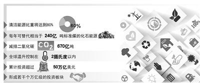 專(zhuān)家預(yù)測(cè),到2050年全球能源互聯(lián)網(wǎng)初步建成時(shí),清潔能源比重將達(dá)到80%,每年可替代相當(dāng)于240億噸標(biāo)準(zhǔn)煤的化石能源,減排二氧化碳670億噸。屆時(shí),全球溫升控制在2攝氏度以?xún)?nèi)的目標(biāo)有望實(shí)現(xiàn)。這一發(fā)展低碳經(jīng)濟(jì)、實(shí)現(xiàn)能源變革轉(zhuǎn)型的系統(tǒng)性解決方案,贏得潘基文、世界銀行行長(zhǎng)金墉、美國(guó)能源部長(zhǎng)莫尼茲等的高度贊賞和積極支持。